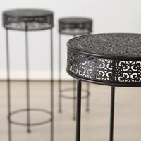 Dekorativní sada stolků v elegantním provedení. Hodí se do každého interiéru například jako stolek pod květiny. Je vyrobena z kovu (železo) v tmavě hnědé barvě. Sada 3 kusů v různých velikostech: výška 55; 65; 75 cm, šířka 20-30 cm.