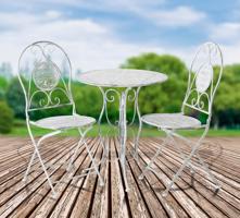 Zahradní sada nábytku pro dva, inspirovaná provensálským stylem. Půvabný design židlí a originální dekorace na desce stolu dodají každému balkonu eleganci. Nábytek lze složit. Materiál: železo Sada obsahuje: 2 židle - 40 x 40 x 92 cm a stůl - Ø 60 x 70 cm Váha: 13 kg Bílá barva s patinou.