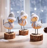 Rozkošní ptačí kamarádi… A protože je venku zima, jsou i oni opatřeni teplou čepicí a šálou. Vezměte je k sobě domů, ať už jim místo najdete na parapetu, komodě, stole, všude se jim bude líbit. Vyrobeno ze dřeva s kovovými křídly a nožkami. Každý stojí na stojánku o Ø 7 cm. Rozměry: 8 x 6 x 14 cm