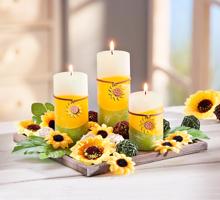 Okouzlující sada, která obsahuje vše, co potřebujete k vytvoření letní dekorace se svíčkami. 3 voskové svíčky v různých velikostech s přívěskem ve tvaru slunečnice dřevěný podnos množství malých květin, listů a ratanových koulí. Svíčky ve 3 velikostech: doba hoření cca 16 / 20 / 24 hodin Výška svíček - 12 / 9,5 / 7,5 cm, každý Ø 5 cm Čtvercový dekorativní podnos - ze dřeva, glazovaný hnědý, 20 x 20 cm