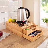 Spolehlivý pomocník s 2 zásuvkami vám udělá v kuchyni pořádek! Tento elegantní organizér je vyroben z udržitelného bambusu a je ideální např. na příbory, jako zásobník na čajové sáčky a další drobnosti a kuchyňské potřeby. Se dvěma prostornými zásuvkami poskytuje spoustu místa a perfektní přehled. Nahoru pak můžete postavit třeba čajovou konvici, ovoce atd. Tento kuchyňský pomocník se hodí do jakéhokoliv interiéru.