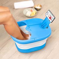 Wellness pro vaše nohy! Prostorově úsporná modro-bílá vanička na koupel nohou je klíčem k rychlému uvolnění a osvěžení. S masážními hrbolky na dně poskytuje unikátní relaxační zážitek. Integrovaný držák na mobilní telefon vám umožní užívat si hudbu nebo filmy i během koupele. S praktickým držadlem. Po složení zabere minimum místa.