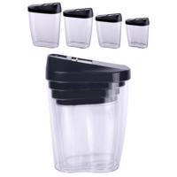 Ideální na suché či sypké potraviny a přísady! 4 černé plastové dózy v různých velikostech jsou jako stvořené na těstoviny či mouku. Právě k využití na sypké přísady je předurčuje praktický výklopný otvor, přičemž při jejich plnění lze sundat celý vršek. Protože je nádoba průhledná, vidíte, co je uvnitř, a snadno ihned najdete, co potřebujete. Jednotlivé dózy mají velikost: 0,45 litru, 0,6 litru, 0,85 litru a 1,25 litru.