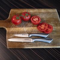 Váš kulinářský zážitek bude ještě lepší se sadou nožů od společnosti Alpina! Sada obsahuje 2 nože s hladkou a vroubkovanou čepelí. Nůž na okrajování o délce přibližně 20 cm je vybaven hladkou čepelí, ideální pro loupání ovoce a zeleniny. Univerzální nůž o délce přibližně 24 cm má zoubkovanou čepel, takže je ideální jak na pečivo, tak na krájení rajčat a sýra. Oba nože jsou vyrobeny z nerezové oceli, což nejenže zajišťuje elegantní a moderní vzhled, ale také dlouhou životnost, hygienické vlastnosti a odolnost proti korozi. Kvalitní nerezová ocel také umožňuje jejich mytí v myčku nádobí.