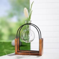 Elegantní dekorativní váza Piston ve tvaru oblouku těží z velmi povedené kombinace dřeva, kovu a skla. A co víc, pozornost okamžitě připoutá její zajímavý baňatý tvar s úzkým hrdlem. Samotná skleněná váza je vyrobena z čirého průhledného skla a krásně v ní vyniknou například menší umělé či sušené květiny. Může být také elegantním doplňkem na vašem pracovním stole. Skvělý tip na dárek, co říkáte?