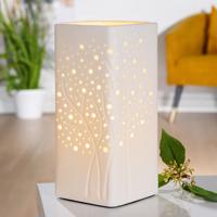 Tato porcelánová stolní lampa s motivy stromů přináší do vašeho domova idylickou atmosféru a harmonii. Její elegantní bílá barva a vzor děr umožňuje jemné prosvětlení skrz porcelán, jehož výsledkem je pěkná hra světla a stínu na okolních stěnách. Jemný a moderní design této lampy dodá vašemu interiéru nový rozměr. Použitá žárovka (není součástí balení) by neměla překročit 40 wattů.