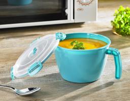 · Hrnek do mikrovlnky pro snadnou přípravu rychlé večeře · S praktickými uzavíratelnými klipy a silikonovým kroužkem · Lze prát v myčce, teplotně odolný od -20° do +120 °C. · Ideální také pro uchovávání potravin v lednici a mrazáku · Objem 900ml Díky hrnku do mikrovlnné trouby snadno a rychle ohřejete nejrůznější pokrmy. Praktické víko s uzavíratelnými klipy a silikonový kroužek nádobu spolehlivě utěsní. Ventil ve víku umožňuje unikání páry. Ideální také pro skladování potravin v lednici a mrazáku. Použitelná při teplotách od -20° do +120 °C. S objemem 900 ml nabízí spoustu prostoru pro nejrůznější pokrmy. Hrnek je vyroben z umělé hmoty a lze jej prát v myčce. Rozměry: Ø 14 cm, výška 9,5 cm (bez víka).
