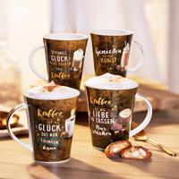 Tyto hnědé hrnky s nápisy s kávovou tématikou jsou ideální pro každého, kdo bez kávy nemůže přežít. Káva je štěstí, které můžete pít. Káva je jako láska v šálku. Pouze silnější. Štěstí si nekoupíte, ale kávu ano. Užívat si je umění. Čtyři krásné hrnky na kávu jsou také dobrým nápadem jako dárek - nejlépe společně s obzvláště kvalitní kávou. Vyrobeno z porcelánu New Bone China. Lze mýt v myčce nádobí a používat v mikrovlnné troubě. Rozměry: Ø 9 cm, výška 10 cm Objem: 350 ml