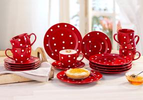 Krásná sada nádobí, která vytvoří u stolu opravdu dobrou náladu. Puntíkovaný červenobílý retro styl se skvěle hodí na každý snídaňový stůl. Vyrobeno z kameniny. Vhodné do myčky i mikrovlnné trouby. Ručně malované, každý kus je originál. Sada obsahuje: 6 šálků - 220 ml 6 podšálků - Ø 15,2 cm 6 dezertních talířků - Ø 19 cm