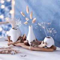 Velmi neotřelý design 3 váz stojících na kusech naplaveného dřeva zaujme na první pohled. Každá má jiný tvar a dohromady tvoří působivý dekorační prvek. Vyzdobte jím stůl a naplňte vázy (vyrobeny z jednoho kusu, nelze je vyjmout) sušenými květinami či větvičkami.