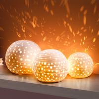 Tyto 3 bílé koule z matného porcelánu s drážkovou strukturou a kulatými otvory vytvoří na stěnách světelný rej připomínající planety. Vaše večery se rozzáří galaktickou hrou světel. Díky pohodlné funkci časovače lze světla v případě potřeby automaticky zapínat a vypínat. Vyrobeno z porcelánu. Provoz každé koule je na 3x AAA baterie (nutno zakoupit zvlášť). Rozměry: Ø 12,5 / 15 / 17,5 cm