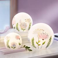 Svítící koule s jemným květinovým vzorem jsou skvělou dekorací do každého interiéru. Po zapnutí se rozsvítí každý den ve stejnou dobu a po 6 hodinách se automaticky vypnou. Ručně malované. Sada 3 velikostí: Provoz na baterie (3 x AA, nejsou součástí). Materiál: sklo. Rozměry: Ø 15 cm (4 LED), Ø 12 cm (3 LED), Ø 10 cm (3 LED).