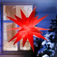 Zářící hvězda vaší zimní dekorace! Jedinečná 18cípá LED venkovní hvězda bude zářit do noci a okouzlovat svou velikostí. Vyrobena z červeného plastu odolného povětrnostním vlivům. Snadná instalace, lehce také složíte k uskladnění. Osvětlena 20 teplými bílými LED diodami s 6 hodinovým časovačem (aktivace na bateriovém boxu). Průhledný kabel s bateriovým boxem - délka 100 cm. Vhodné pro venkovní použití.