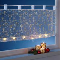 Do okraje této jemné záclonky byl decentně zapracován malý světlený řetěz. Malované vánoční motivy se lesknou ve zlatých barvách. Se spínačem ON/OFF.