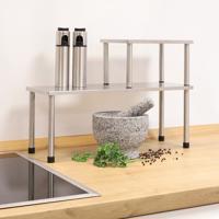 Dvoupatrová nerezová polička je praktickým pomocníkem k úspoře místa a zároveň elegantním doplňkem např. na kuchyňskou linku. Polička kombinuje odolnost nerezové oceli s funkčností protiskluzových gumových nožiček, čímž zajišťuje nejen estetický dojem, ale i bezpečnost a stabilitu při každodenním používání. Nerezová ocel je pevná a odolná vůči poškození a snadno se udržuje v čistotě. Protiskluzové gumové nožičky poskytují pevný a stabilní základ, což zabraňuje posunutí nebo sklouznutí konstrukce. To znamená, že na polici můžete bez obav umístit těžší nádoby, kuchyňské spotřebiče nebo další předměty, aniž byste měli obavy z jejich pádu či poškození.