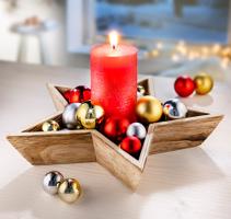 Stylový soubor svíčky a vánočních ozdob, který vám nabízí mnoho krásných možností dekorace! Můžete ji umístit na příborník, jídelní stůl nebo parapet. Tuto kompletní sadu můžete naaranžovat klasicky tak, že do dřevěné hvězdy umístíte červenou svíčku a kolem ní seskupíte koule na vánoční stromek. Obsah sady: Červená vosková svíčka (doba hoření cca 28 cm); Ø 5 cm, výška 10,5 cm. Dřevěná miska Ø 22,5 cm, výška 3,7 cm 44 koulí na vánoční stromek v červené, zlaté a stříbrné barvě, lesklé a matné; Ø 2- 3 cm