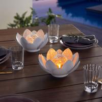 Krásná náladová solární lampa v podobě rozvinutého lotosového květu. Střed tvoří skleněná koule z krakelovaného skla osvětlená 1 LED diodou v neutrálním bílém tónu. Vhodné pro venkovní použití, neboť dobíjení integrované baterie probíhá přes skrytý solární panel.