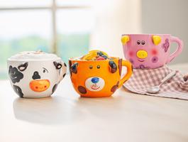 Přicházejí tři legrační jumbo misky ve tvaru krávy, prasete a psa. S objemem 550 ml nabízejí dostatek prostoru: ať už pro velký šálek čaje, XL latté nebo třeba ovocný salát. A se svými láskyplně navrženými "obličeji" rozhodně přinášejí na stůl velkou porci veselí. Objem: 550 ml Vhodné do mikrovlnné trouby a myčky nádobí