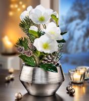 Bílé květy této tradiční podzimní květiny jsou vyrobeny z vysoce kvalitního textilního materiálu a vypadají úžasně přirozeně. Elegantní květy jsou doplněny umělými větvičkami jehličnanu a pravými šiškami. V keramickém květináči s rýhovanou strukturou a stříbrným lesklým povrchem se toto květinové aranžmá dokonale vyjímá. Rozměry: Ø cca 16 cm, výška cca 31 cm