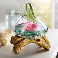 Skleněná váza zajímavého tvaru nabízí široké uplatnění na květiny, oblázky, sukulenty či svíčky. Se základnou ve tvaru kořene je vhodná na vnitřní i venkovní dekorace. Doplňující rozměry: průměr hrdla 7 cm.