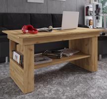 Výškově nastavitelný konferenční stolek s klikovým systémem. Rozšiřitelný ze 115 cm na 157 cm. Reprodukce struktury dřeva. Rozměry: š. 115/157 x v. 52.5/59 x h. 65 cm. Povlak z melaminové pryskyřice a velký úložný prostor.