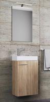 Moderní koupelnovou sestavu Slito tvoří prostorná závěsná skříňka s keramickým umyvadlem, zrcadlo na zeď a elegantní LED světlo. Díky úsporným rozměrům se hodí např. na toaletu či do menší koupelny. Skříňka v provedení sonoma dub s výklopnými dvířky k umístění koupelnových doplňků a toaletních potřeb. Zrcadlo je vyrobeno z pevného bezpečnostního skla. LED osvětlení Slito (2,5 W) je minimalistické a velmi atraktivní (vč. 30cm kabelu). Jednoduchá montáž na stěnu. Vodovodní baterie a světlo nejsou součástí dodávky.