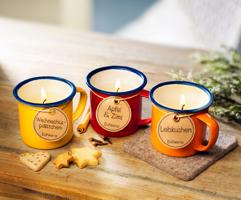 Příjemné svíčky pro chladné roční období… s vůní jablka a skořice, perníku a vánoční sušenky. Doba hoření každé cca 20 hodin. Ve vzhledu nostalgických smaltovaných hrnečků – moderní a retro, barevné s tmavě modrým okrajem. Vyrobeno z kovu - pravý vosk v krémově bílé barvě s 5 % vůní. Rozměry: včetně ouška cca 9 x 7 x 6 cm.
