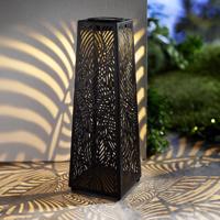 Venkovní kovová lucerna na solární provoz vyniká půvabným listovým vzorem a spoustou výřezů. Užijte si odlesky, které posílají do okolí. Lucernu stačí umístit na světlé místo a nechat ji naplnit váš večer světlem a hrou stínů. S teplou bílou LED diodou a integrovaným solárním panelem (včetně nabíjecí baterie).