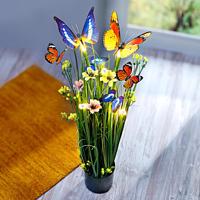 Vpusťte si domů trochu romantického lučního života! Nádherní pestrobarevní motýli zdobí umělou rostlinu v květináči a úžasný vizuální zážitek ještě umocňuje osvětlení drobnými LED diodami na bateriové napájení. Působivá dekorace je ozdobena drobnými průhlednými třpytivými krystaly. Ty se společně s motýly nádherně rozzáří, jakmile se pod nimi rozsvítíte diody. Dekorace je díky venkovnímu bateriovému boxu s krytím IP44 vhodná pro interiéry i exteriéry. Venku ji lze postavit, nebo klidně zakopat do záhonu. Krásně také vynikne na balkoně, terase či parapetu. Využijte funkci 6hodinového časovače pro automatické zapnutí a vypnutí. Popis: umělé trávy a květiny v přírodním vzhledu, částečně vyrobené z jemné textilie 4 plastoví motýli s funkcí kývání 2 motýli ze skelných vláken, každý osvětlený bílou LED diodou (bez funkce kývání) 3 krystaly z průhledného plastu, každý osvětlený bílou LED diodou v černém plastovém květináči s umělým mechem