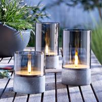 Užívejte si kouzelné světlo svíček, kdekoli chcete. S těmito 3 LED svíčkami v sadě můžete vykouzlit atmosféru venku na balkoně a terase nebo uvnitř v obývacím pokoji či ložnici! Jemné mihotavé světlo trojrozměrných plamenů LED svíček vypadá klamně reálně ale na rozdíl od skutečných svíček, jsou bezpečné a mohou svítit i bez dozoru. Spodní část svícnu z litého kamene v módním betonovém vzhledu je doplněna válci z ušlechtilého kouřově šedého skla s decentním duhovým efektem. Díky provozu na baterie, můžete svícny umístit kamkoliv chcete, ať už jednotlivě, nebo jako sadu. LED svícny Nero: 3 LED svíčky z umělého kamene ve vzhledu betonu každá s šedě zbarveným, duhovým skleněným válcem osvětlené teplou bílou LED diodou 3D plameny s diskrétním efektem blikání napájení na baterie: každá vyžaduje 2 baterie AA (nejsou součástí dodávky) vhodné pro venkovní použití (prostor pro baterie s krytím IP44) s 6hodinovým časovačem Rozměry: Ø 8 cm každý, výška 10/12,5/15 cm