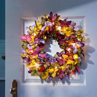 Nepřehlédnutelný věnec v jarních barvách s integrovaným LED osvětlením ozdobí stůl, dveře, okno i chráněné venkovní prostory. Je bohatě zdobený 60 látkovými motýlky a osvětlený 30 LED diodami.Je tedy nápaditým dekorativním doplňkem i bez světla, ať už zavěšený, položený nebo jako jarní věnec na dveře. Jemní motýli jsou vyrobeni z vysoce kvalitního textilního materiálu a na křídlech mají filigránový vzor. Díky bezdrátovému provozu na baterie nepotřebujete v blízkosti žádnou zásuvku a můžete se zcela svobodně věnovat výzdobě. A díky praktickému časovači se osvětlení v případě potřeby automaticky zapíná a vypíná. LED věnec Motýli: bohatě zdobený 60 motýly z textilního materiálu ve žluté, fialové, růžové, zelené a bílé barvě osvětleno 30 teplými bílými LED diodami 6hodinový časovač napájení na baterie (na 3 AA baterie, nejsou součástí dodávky) vhodné pro vnitřní i chráněné venkovní použití