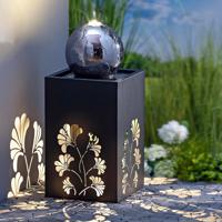 Zahradní fontána Ginkgo vám zpříjemní chvíle strávené na zahradě. Fontána Ginkgo představuje elegantní spojení vody a světla, které dodá vašemu venkovnímu prostoru čarovný nádech. Tvoří ji kovový sloup ozdobený listem ginkgo a nerezová koule s 6 LED diodami, z níž vytéká voda. Fontána má uzavřený vodní okruh, čerpadlo je součástí dodávky. Provoz ze sítě, s 3m přívodním kabelem.