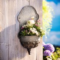Elegantní kovový nástěnný květináč v antickém stylu a ve starošedé barvě vám zpestří chvíle na zahradě. Je ideální pro přímou výsadbu nebo umístění květináče do průměru 12 cm. Dva odtokové otvory zabraňují zamokření. Ideální např. na terasy a balkony. Snadná montáž na stěnu.