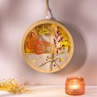 Zpestřete si každý den pohledem na osvětlenou scenérii dvou motýlů vznášejících se nad rozkvetlou loukou. Kouzelná závěsná LED dekorace je vyrobena z dřevěné překližky a kromě 3D siluet motýlů ji v kruhu zdobí i skutečná sušená květina připevněná jutovou stuhou. Její krása vynikne ještě lépe ve tmě, protože ukrývá 15 LED diod na bateriové napájení. Využijte praktický 6hodinový časovač, který osvětlení ovládá automaticky. Po aktivaci se po 6 hodinách automaticky vypne a po 18 hodinách opět zapne na dalších 6 hodin.