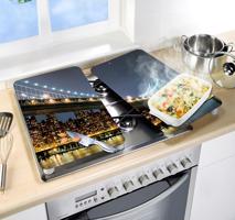 · Skleněné ochranné desky pro všechny druhy sporáků, set dvou kusů · Použitelné také jako krájecí prkénko · Balení obsahuje 4 výškově nastavitelné protiskluzové nožičky pro upevnění desek Krycí desky s motivem slavného mostu v New Yorku díky speciálním podstavcům spolehlivě ochrání všechny typy sporáků. Krycí desky slouží k odkládání horkých hrnců a pánví. Zároveň ale mohou být použity také pro zvětšení pracovní plochy – například pro přípravu pokrmů. Ochranné desky splňují nejvyšší hygienické normy – neporézní povrch zabraňuje výskytu bakterií i nežádoucím pachům. Extrémně robustní a téměř nerozbitné desky (odolné proti nárazu) mají evropskou patentovou ochranu. Materiál: tvrzené sklo, umělá hmota Rozměry: každá deska 52 cm x 30 cm x 1,8-4,5 cm
