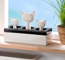 Je to tak jednoduché: Naplňte keramické truhlíky vodou. Postavte je nejlépe na radiátor nebo na parapet. Roztomilé kočičky nasají z pórovité keramiky vodu a vypařováním rovnoměrně šíří vlhkost do okolí. To zajiš´tuje příjemné klima a dobrý pocit. Kromě toho se kočičí rodinka vyznačuje originálním designem. Náš tip: Také skvělé jako osvěžovač vzduchu! Dejte do vody jen pár kapek vonného oleje (není součástí balení). Zvlhčovač: nádoba na vodu z glazované keramiky kočka z pórovité keramiky velký povrch pro lepší odpařování
